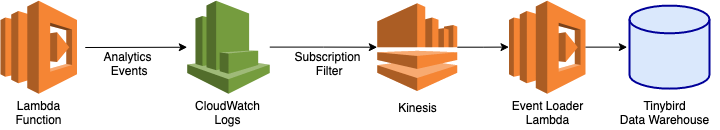 In this pipeline, a Lambda function writes analytics event data as structured JSON payloads to CloudWatch Logs. From there, we use a subscription filter to extract the events from the function’s log group and deliver them directly to a Kinesis stream. Finally, a separate Lambda function consumes events off the stream in batches and delivers them to our Tinybird data warehouse via their HTTP API. Tinybird is a managed data platform that helps developers build real-time data solutions with familiar tools like HTTP APIs and SQL on top of fully managed ClickHouse clusters.