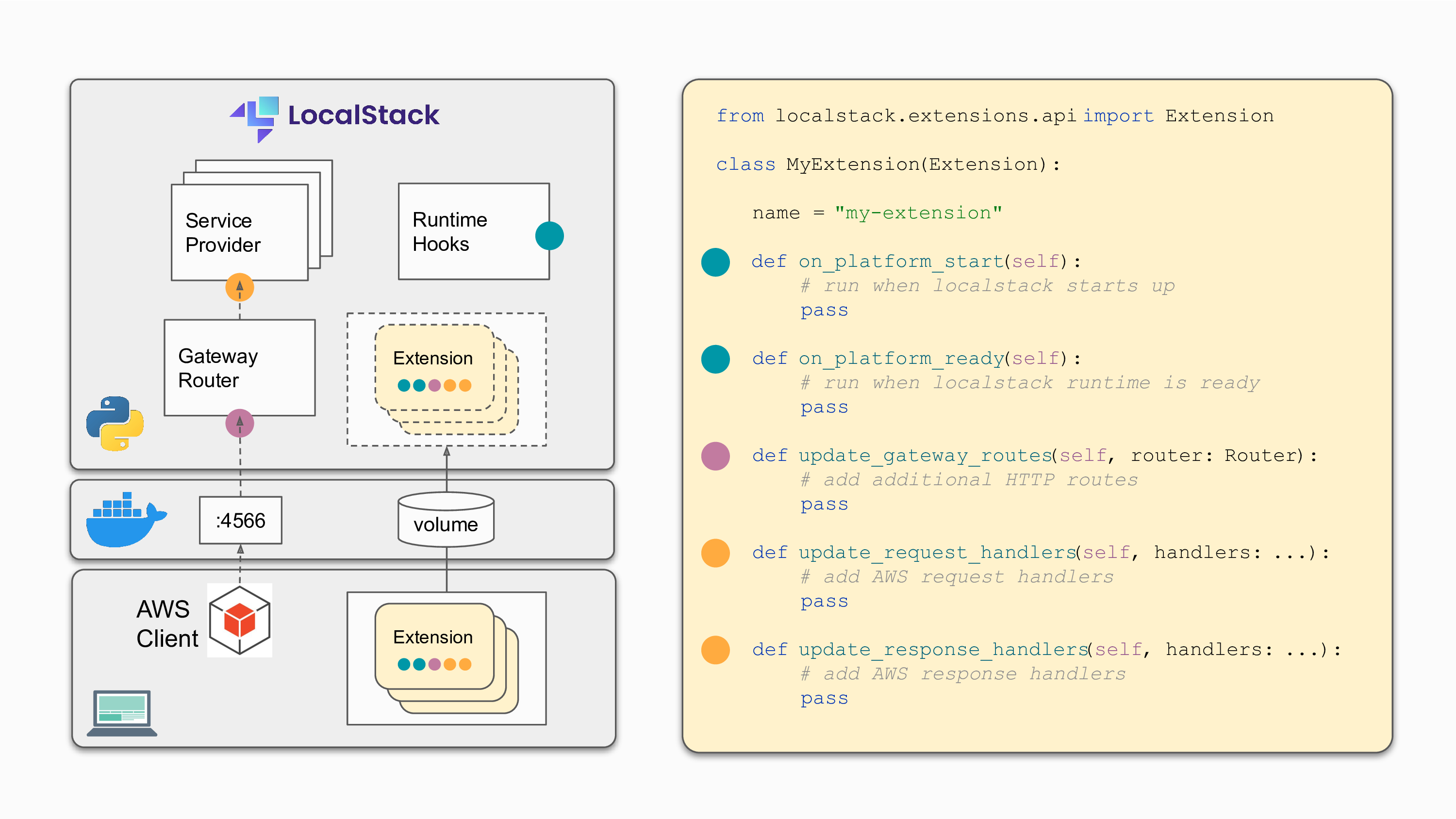 LocalStack Extensions is a Python application that runs alongside the main process in the LocalStack Docker container. LocalStack Extensions allows you to hook into different lifecycle phases of LocalStack and execute custom code or modify LocalStack’s HTTP gateway with custom routes and server-side code.